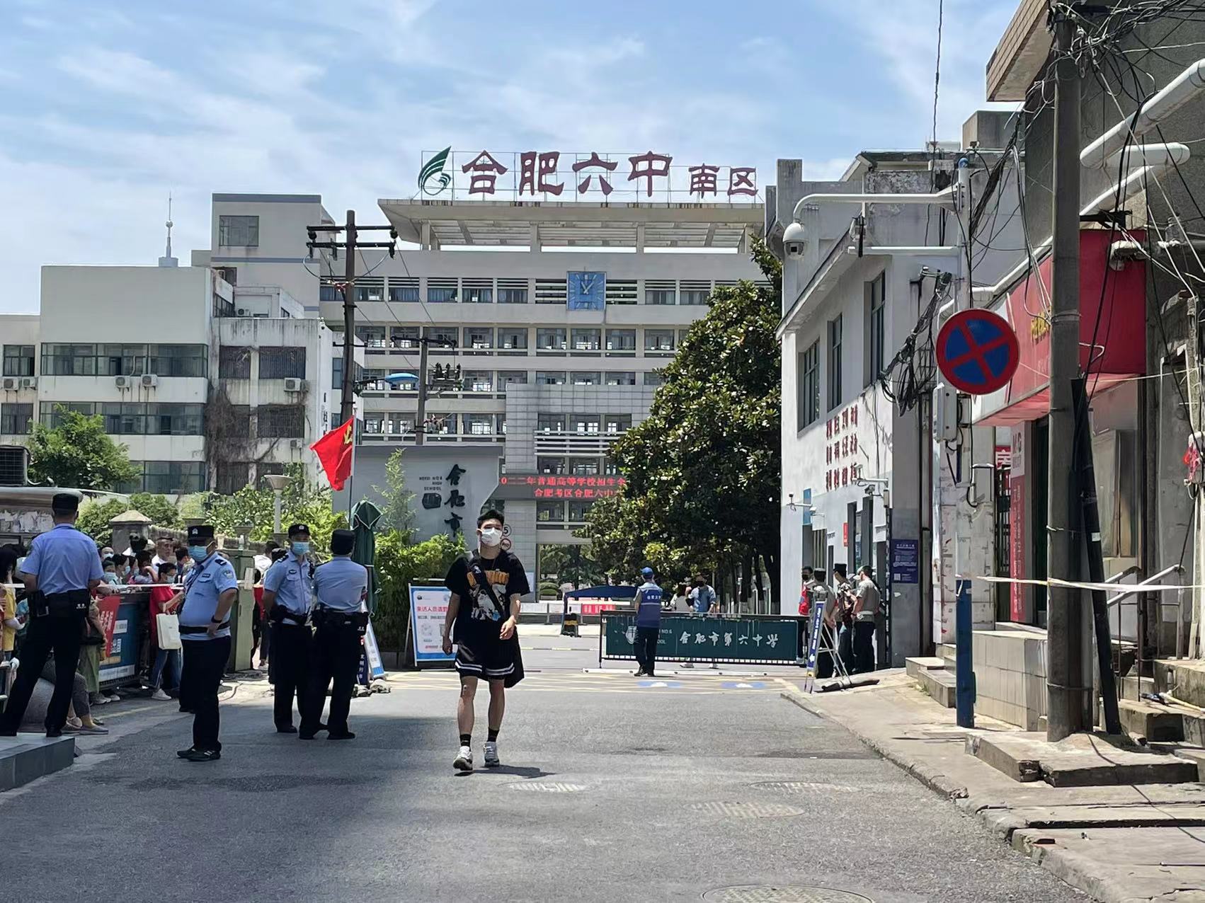 上午语文考试结束,合肥五十中天鹅湖校区考点的考生陆续走出考场。
