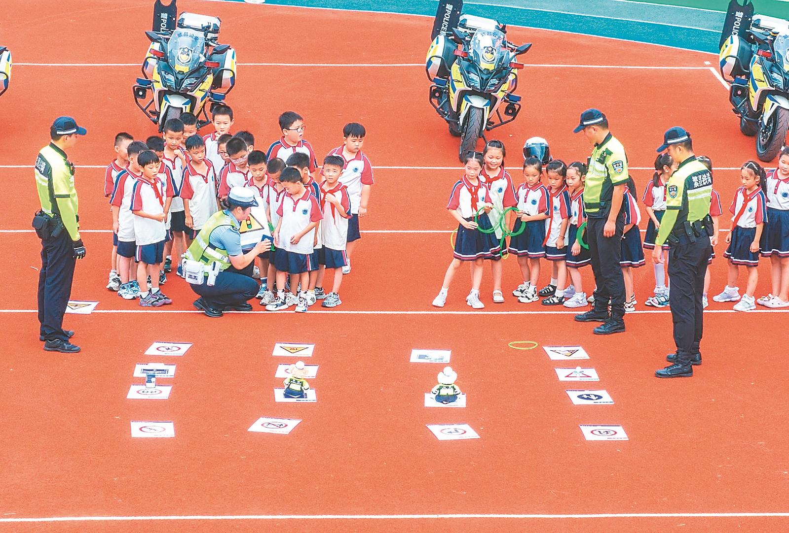 9月1日,在芜湖市繁昌区繁阳镇城关四小,交警组织学生通过“套圈识标志”游戏强化交通标识认知。通讯员 肖本祥 摄