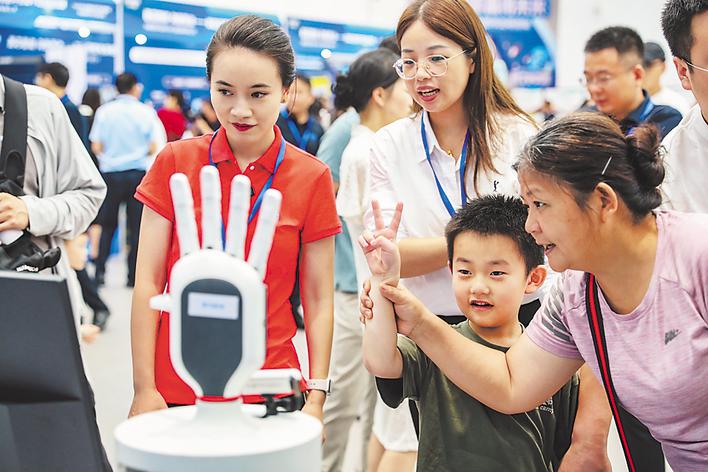 市民和一款机械“灵巧手”玩猜拳游戏。