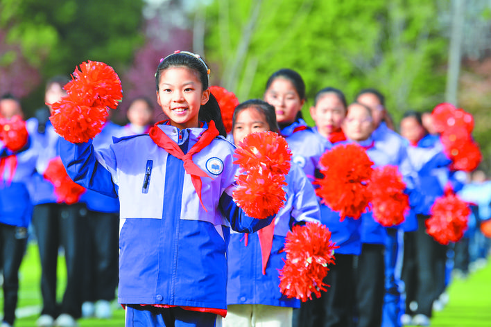 11月27日,合肥市少儿艺术学校站塘校区的学生在操场上进行大课间活动。近年来,学校积极落实“双减”政策,根据学生年龄结构设置啦啦操、体操、跳箱等项目,让学生在快乐的运动中增强体质、健康成长。