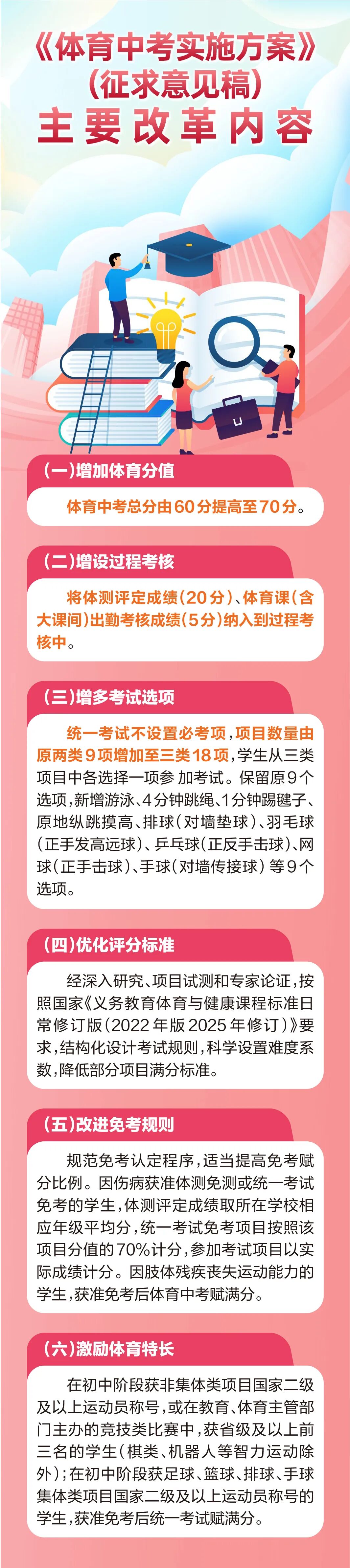 为落实好国家、省市有关决策部署,破解体育中考过去存在的“应试倾向明显、项目类型局限、评分标准不适配”等问题,迫切需要推动实施体育中考改革。本次改革围绕“三增一优”,即通过增加体育分值、增设过程考核、增多考试选项、优化评分标准,进一步缓解学生和家长的备考焦虑与训练负担,提高学校、家庭和社会对青少年身心健康的重视程度,促进学生在持之以恒的运动中享受乐趣、增强体质、健全人格、锤炼意志,为全面发展与终身幸福奠定基础。